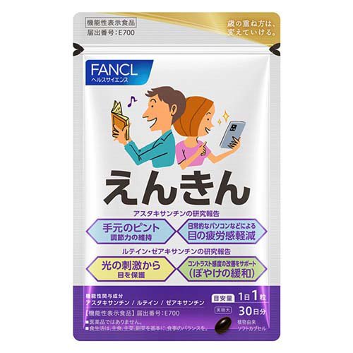 ●「えんきん」は、ファンケルが厳選した3成分アスタキサンチン、ルテイン、ゼアキサンチンを複合配合した機能性表示食品です。