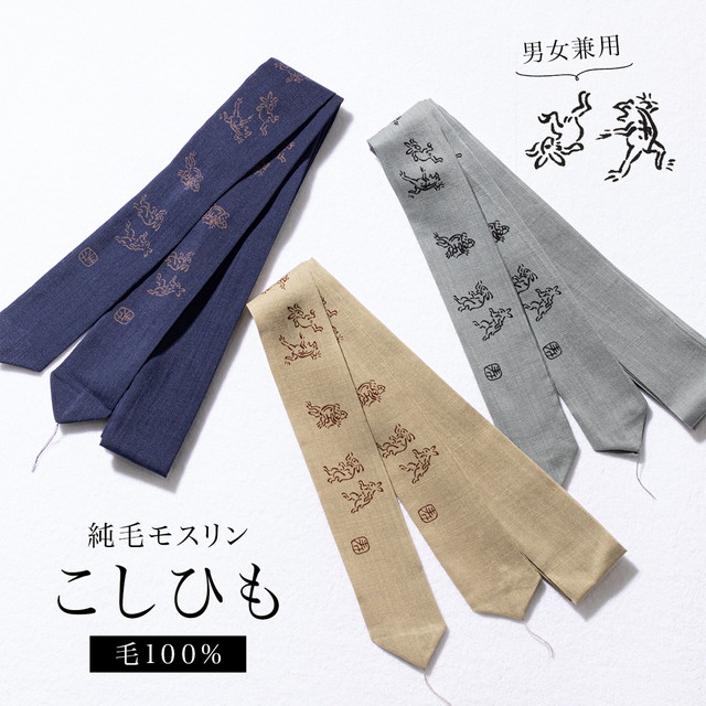 腰紐 モスリン 着物 男性 女性 腰ひも メンズ レディース 灰色 紺 ベージュ 兎 うさぎ 蛙 鳥獣人物戯画 ウール こしひも 着付け小物 和装小物 メール便