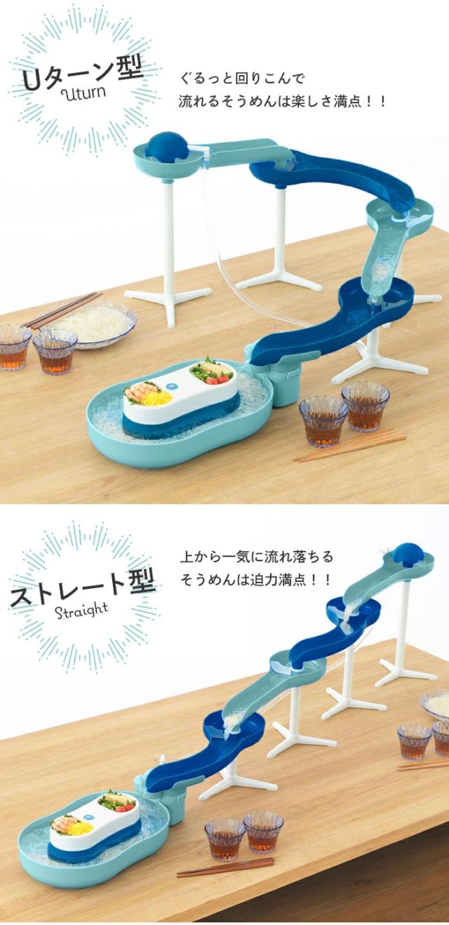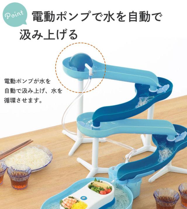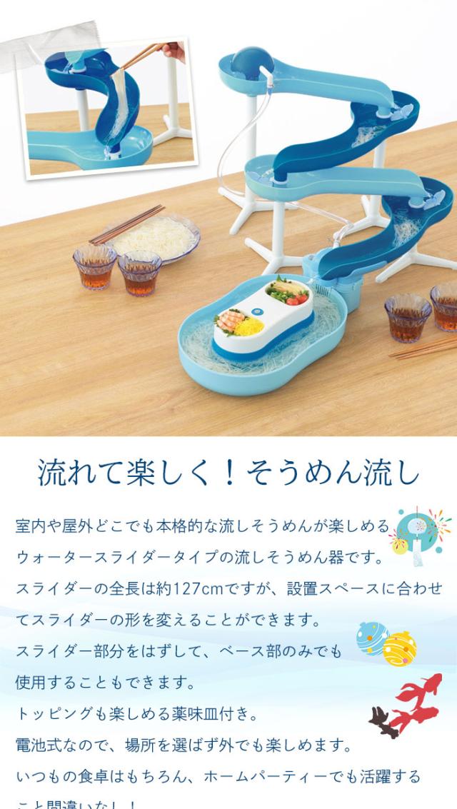 | ・食卓のスペースに合わせてスライダーの形を調整できます! ・スライダーを滑りおりてくるそうめんをキャッチ!つかみそこねたそうめんは流れる器でゆっくり頂けます。 ・電動ポンプで水を自動汲み上げ。 ・乾電池式なので野外でも楽しめます! ※乾電池は別売りです。 |