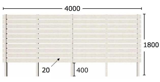 ・ サイズ:全体:W4000×H1500(mm)/板間隔:20/フェンス下空き:約250/柱埋込:約400(mm)