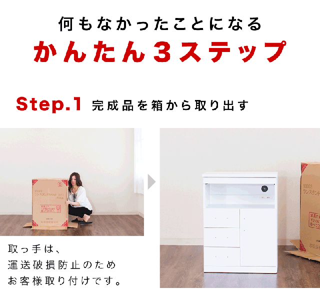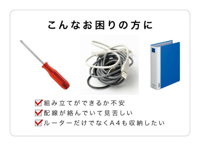転居に伴い、インターネットの配線やルーターが収納できてFAXも置ける台を探していました。組み立て済みでしたので取っ手を付け替えるだけで完了しました。スリムで収納力もたっぷりですのでおすすめの商品です。