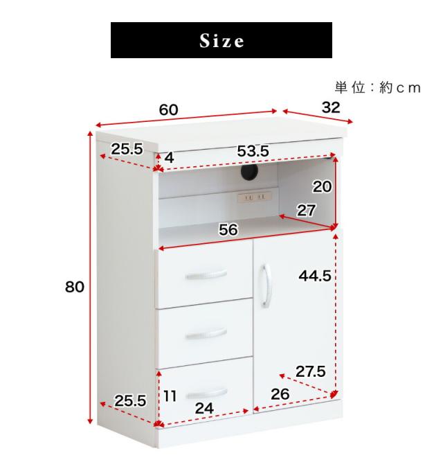 | 商品サイズ:約W60×D32×H80cm 上部引出し内寸:約W53.5×D25.5×H4cm 下部引出し内寸(3杯) 約W24.5×D25.5×H10(13)cm(ストッパー付き) 天板下空間:約W56×D27×H20cm 扉内内寸:約W27×D27.5×H44.5cm 可動棚:約W27×D24.5cm 1枚付き(3.3cmピッチ7ヵ所移動可能) | ||||