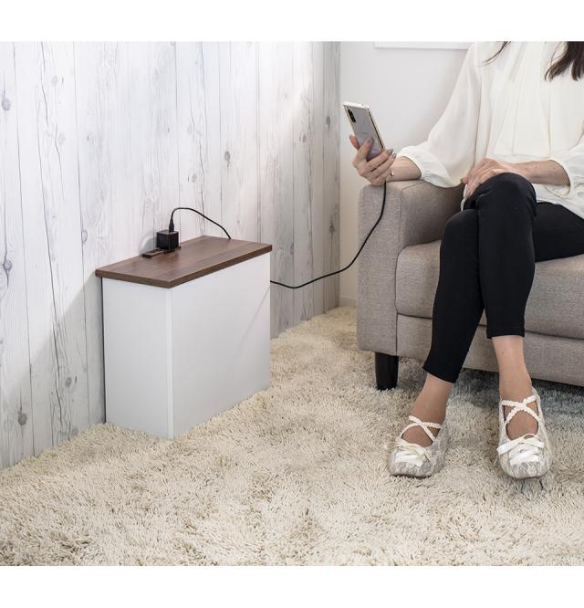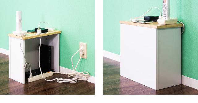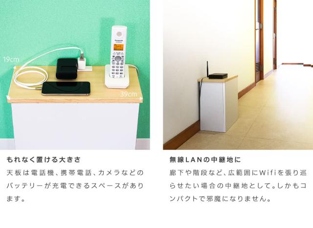 | 2way Cable storage 賢く充電。すっぽり置くだけ。 壁・角にぴったり 充 電スタンド 配線隠し ケーブル・コンセントなど、丸ごとすっぽり 日々の充電に便利な2口コンセント コンセント・タップ・接続機器など全部まとめて隠せます 幅木避けで壁にぴったり 毎日使う機器の指定席 天板の2口コンセントを利用し、携帯電話、ノートパソコン、その他 毎日使う機器の充電ステーションとして ケーブル収納 兼 目隠し 常に電源を供給するテレビをはじめとした家電、インターネット等の配線タップ収納、コンセント隠し、ほこり避けとして 難しいのは要らない。シンプルにこだわっています。 1.3枚の板をコの字状にします 2.天板を取り付けます 3.コンセントを取付て完成 隠したい場所に被せるだけ Simple for everyone 組み立てから設置までどなたでも分かりやすい 機能・詳細 壁面・コーナーどちらにもすっきり設置 約1cmのスリットを設けていますので、天板から伸ばした配線をコンセントに接続し、幅木を避けて設置することができます。 まるごと隠す 横長のケーブルタップや、縦長のルーター等を床面に置いたまま、被せるだけでどちらも隠せます。 天板の2か所で同時充電 毎日欠かせない携帯電話やタブレット端末などの充電ステーションに。 もれなく置ける大きさ 天板は電話機、携帯電話、カメラなどのバッテリーが充電できるスペースがあります。 無線LANの中継地に 廊下や階段など、広範囲にWifiを張り巡らせたい場合の中継地として。しかもコンパクトで邪魔になりません。 Color ウォールナット ホワイト&ナチュラル |