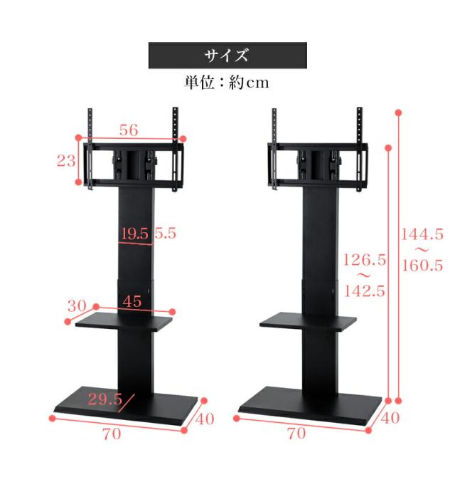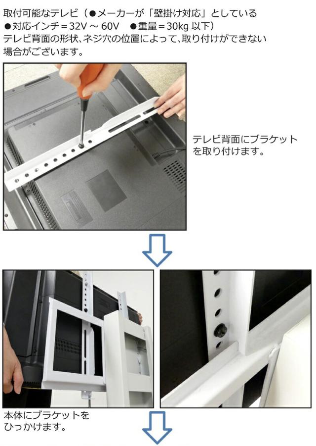 | 商品仕様 | 材質:スチール、粉体塗装 取付可能なテレビ:壁掛け対応しているテレビ、32V〜60V、重量30kg以下、テレビ背面にネジ穴が4箇所あり、間に凹凸がない、ネジ穴の間隔が同じで、上下ともに10cm〜40cmの範囲 5段階の高さ調節 左右30度の角度調節可能、アジャスター 転倒防止用金具付き |