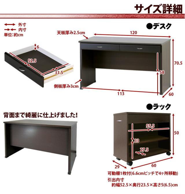 | 【デスク】 本体:幅120×奥行60×高さ70.5cm 引出内寸:約幅52.5×奥行33.5×高さ6(6.5)cm(2杯) 引出下空間高さ:約58cm 側板厚み:約3cm 天板厚み:約2.3cm 【ラック】 本体:幅60×奥行29×高さ50cm 引出内寸:約幅52.5×奥行23.5×高さ5(6.5)cm 有効内寸:約幅55.5×奥行27.5×高さ33cm 可動棚1枚付(6.6cmピッチで4ヶ所移動) | ||||