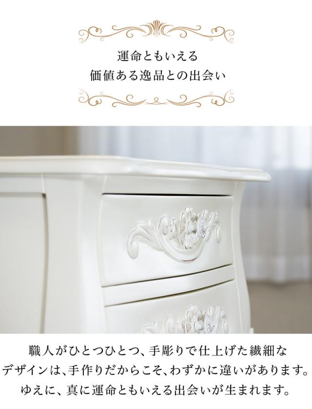 エレガントなヨーロピアン調アンティーク風チェストです ホワイトのロココ調チェスト ロイヤルプリンセス/ゴージャス/エレガンス/クラシカル/アールデコ/姫家具/ヨーロピアン風の家具をお探しの方に チェスト猫足チェストねこ脚チェストねこ足サイドチェスト電話台引き出し 雑貨ショップやサロンにあるような 白家具 アイボリーホワイト 部屋の主役になる可愛い猫脚の収納チェストです。花台やサイドチェストにもお勧めのヨーロピアン風チェスト 滑らかな曲線を描くクラシカルな雰囲気