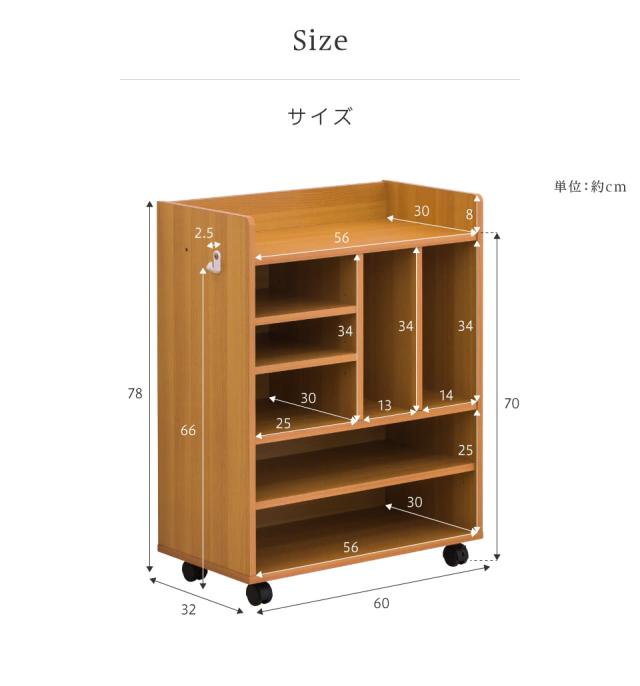 | 天板高:70cm 上棚:幅56cm×奥30cm×高8cm 中左棚:幅25cm×奥30cm×高34cm 中中棚:幅13cm×奥30cm×高34cm 中右棚:幅14cm×奥30cm×高34cm 下棚:幅56cm×奥30cm×高25cm フック高:66cm |
