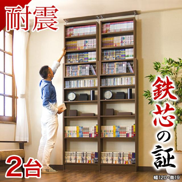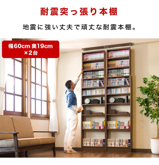 【2台セット】本棚 耐震突っ張り本棚 幅120 奥行19 ホワイト ブラウン 木製 耐震 薄型 幅120 スリム 大容量 壁面収納 壁面 オシャレ 天井 突っ張り つっぱり オープン 転倒防止 地震対策 コミック ディスプレイラック ウォールナット 白 茶色 木目 南海トラフ 地震対策