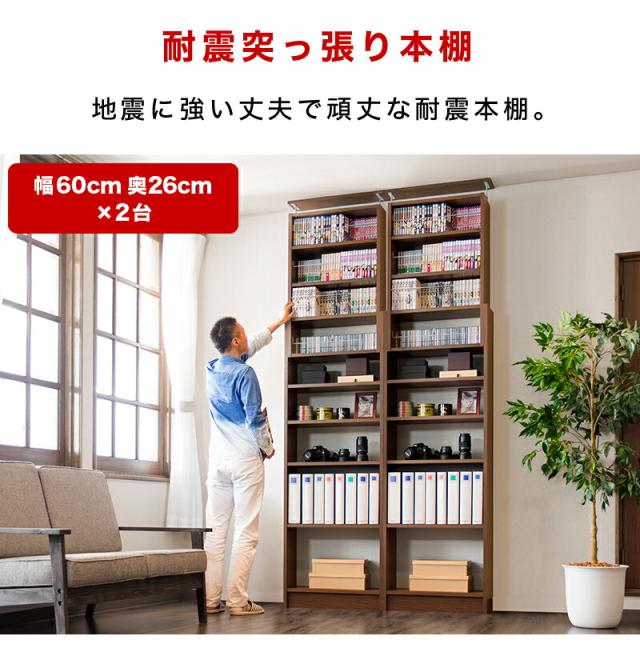 【2台セット】本棚 耐震突っ張り本棚 幅120 奥行26 ホワイト ブラウン 木製 耐震 薄型 120 スリム 大容量 壁面収納 壁面 オシャレ 天井 突っ張り つっぱり オープン 転倒防止 地震対策 コミック ディスプレイラック ウォールナット 白 耐震本棚 鉄心 鉄芯