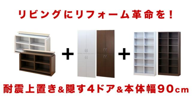 シンプル本棚9018、幅90cmシンプルシェルフ扉と上置き付きセット、地震対策に転倒防止の上置き付き本棚、子供部屋の整理や、事務所の書類棚や業務用の書棚に最適。多機能で自由にカスタマイズ出来、並べて壁面収納として使える。