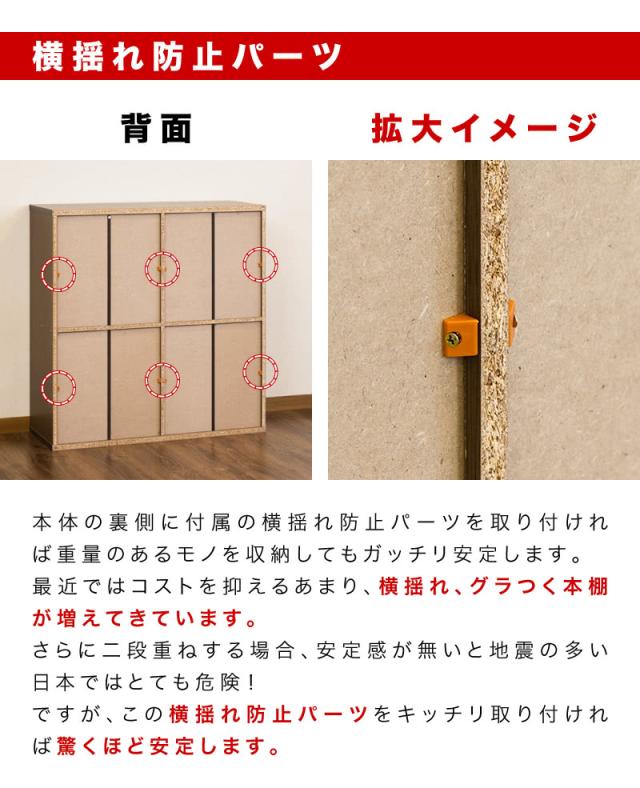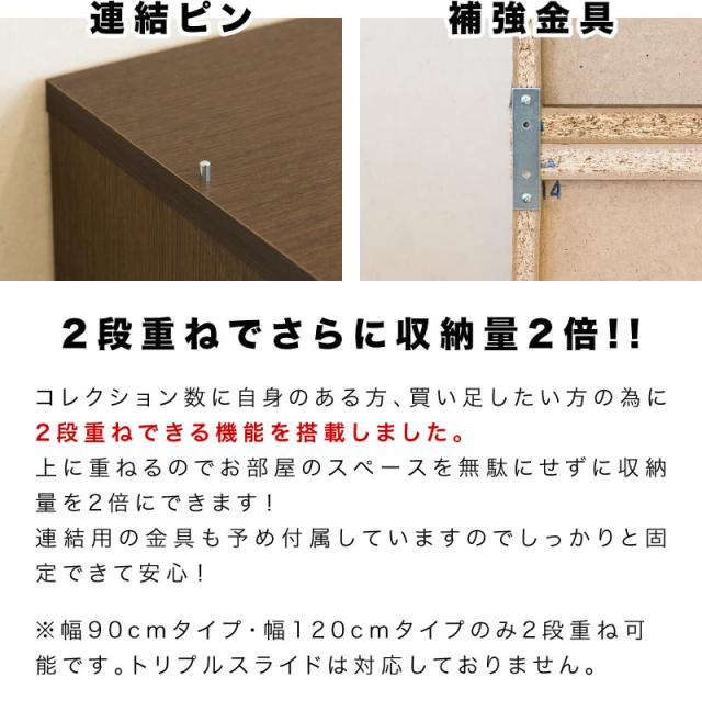 はみ出ず、DVD・本を劣化や汚れから護ります。安心宣言!!各種補助金具完備!転倒防止パーツ倒れるのを防ぐ転倒防止パーツ付きで安心。横ゆれ防止パーツ本体裏側には横ゆれ防止のパーツを使用。重量物の収納もバッチリ!たっぷり収納を誇るからには、もしもの為の安定感を強化しました!2段重ねにしてさらに大量収納可能!固定は連結ピンと補強金具で2重の安心!上下に2台重ねることで、限られたスペースにさらに大量に収納出来ます、ビス穴をキレイに隠すシール付属。前後2段スライド棚では当たり前なので、言うのが遅くなりましたが…!勿論大量に収納できます!!
