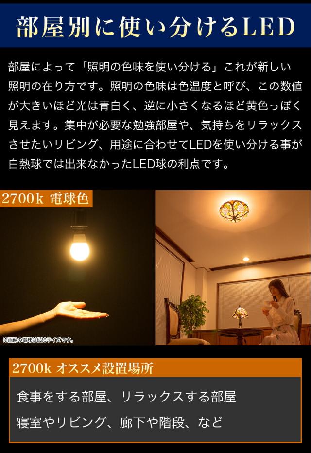 | 商品仕様 | 40w形相当 配光角250度 演色評価値Ra80 消費電力4.5w 明るさ444lm 色温度2700k |