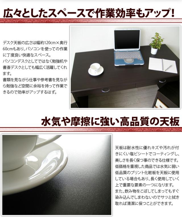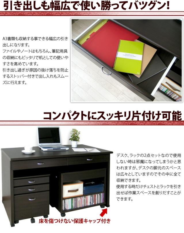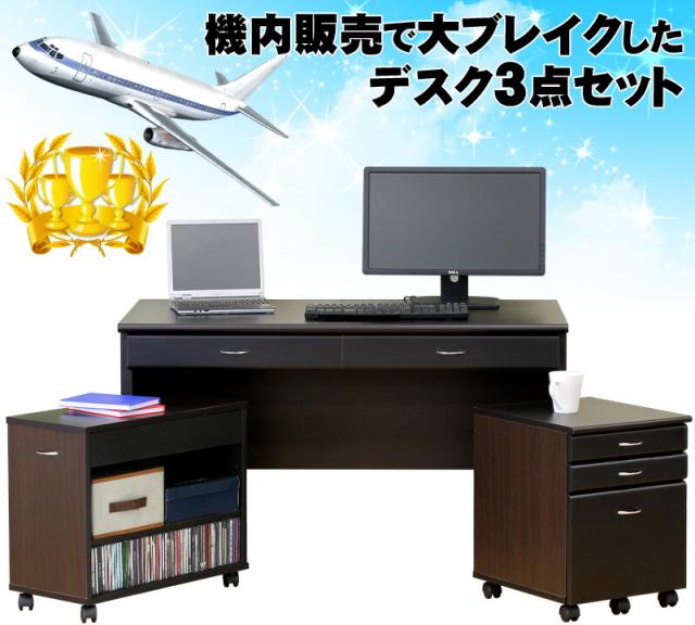 | 機内販売で大ヒットを記録したパソコンデスクのご紹介です。 自然な色合い、色々な部屋に馴染みやすいナチュラルと、シックな空間を演出する落着いたチョコレートブラウン。書斎でのパソコンデスクとしても是非お使いいただきたいセット。チェスト・ラック付の正統派パソコンデスクの決定版です。 チェストは小物用2段、書類用1段の計3段。下部引出しはA4ファイルが収納可能、引出し下にキャスター付きで開閉がラクにでき、転倒防止にもなっています。ラックは取って付きで移動しやすく容量も大きめです。棚板を調節することで、レイアウトの幅も広がります。天板部分はサイドテーブル代わりに利用でき、機能的に優れたシステムデスクです。使用しない時は、チェストとラックはデスク下に収める事ができます。 ※配送梱包は2ヶになります。 北欧好きやDIY好きにもオススメ! 一人暮らし・ファミリー・子供部屋からオフィスまで 新生活におすすめの高品質でおしゃれな家具・インテリア・生活雑貨の通販サイト、家具ドキッ!です!! なるべく安い価格でご提供するために、工場出荷(ファクトリーアウトレットシステム)でのお届けを導入しています。 | ||||