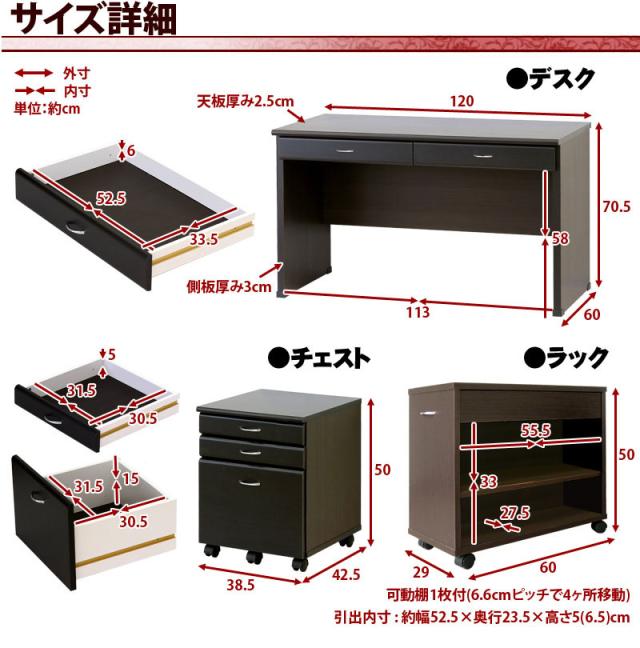 | 【デスク】 本体:幅120×奥行60×高さ70.5cm 引出内寸:約幅52.5×奥行33.5×高さ6(6.5)cm(2杯) 引出下空間高さ:約58cm 側板厚み:約3cm 天板厚み:約2.3cm 【チェスト】 本体:幅38.5×奥行42.5×高さ50cm 引出内寸:(小2杯)約幅31.5×奥行30.5×高さ5cm (大1杯)約幅31.5×奥行30.5×高さ15(21.5)cm キャスター5ヶ付(ストッパーなし) 【ラック】 本体:幅60×奥行29×高さ50cm 引出内寸:約幅52.5×奥行23.5×高さ5(6.5)cm 有効内寸:約幅55.5×奥行27.5×高さ33cm 可動棚1枚付(6.6cmピッチで4ヶ所移動) | ||||