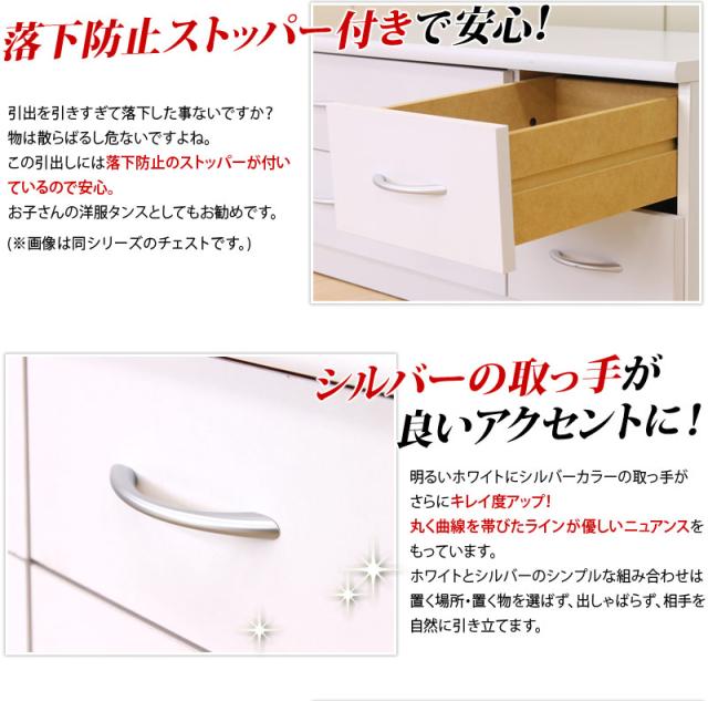 最後にもう一度、機能の要点をチェック!! 1、お部屋が明るくなるホワイト家具! 2、ワンルームや子供部屋にもピッタリ コンパクトサイズ 3、小さくてもしっかり収納!見た目以上の収納力! 4、引出は落下防止ストッパー付き!安心設計! 5、安定感は抜群!袴付き 6、シルバーの取っ手が良いアクセントに! 曲線を帯びた優しい印象! 充実の機能がそろった コンパクト家具シリーズ!! | |||||||||||