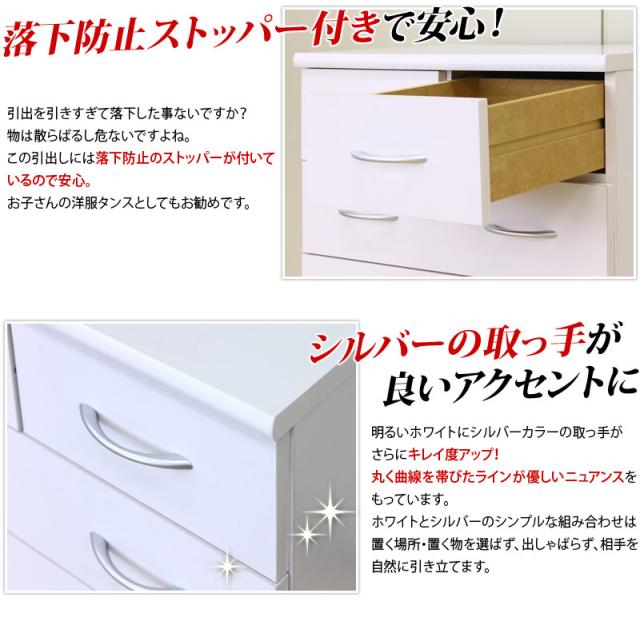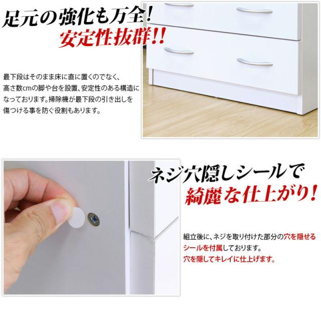 最後にもう一度、機能の要点をチェック!! 1、お部屋が明るくなるホワイト家具! 2、ワンルームや子供部屋にもピッタリ コンパクトサイズ 3、小さくてもしっかり収納!見た目以上の収納力! 4、引出は落下防止ストッパー付き!安心設計! 5、安定感は抜群!袴付き 6、シルバーの取っ手が良いアクセントに! 曲線を帯びた優しい印象! 充実の機能がそろった コンパクト家具シリーズ!! | |||||||||||