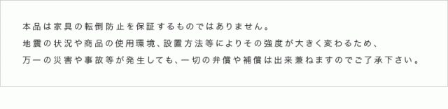 | 補助製品ですので災害時等の保証は致し兼ねます。 全ての使用状況において同じ性能を保証するものではありません。 棚本体が湾曲する恐れがあります。 緩まない程度に軽く締めご利用ください。 触れたり衝撃が加わると緩んできますので 定期的に締め直してください。 商品画像は色合いや素材感が実際の商品と異なる場合がございます。 モニター・ディスプレイによっても写り方が変ります。予めご了承ください。 本品は家具の転倒防止を保証するものではありません。地震の状況や商品の使用環境、設置方法等によりその強度が大きく変わるため、万一の災害や事故等が発生しても、一切の弁償や補償は出来兼ねますのでご了承下さい。 |
