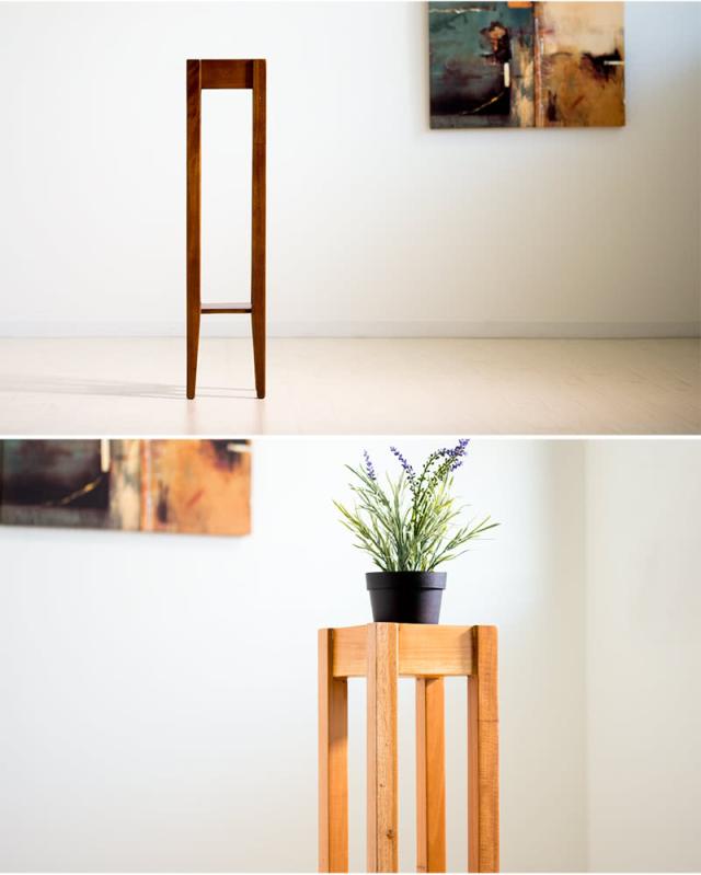 小さな花瓶や鉢植えの置き台や、飾り棚として使える、オシャレな脚付きの木製ラックです。