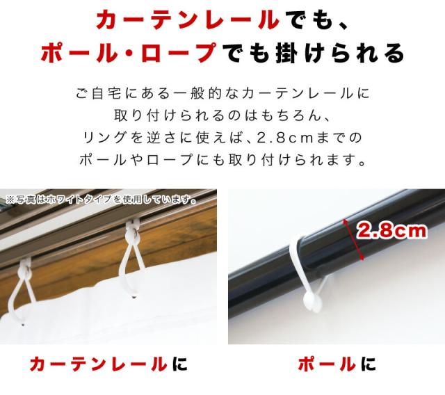 付属のリングは、ご家庭のカーテンレールにワンタッチで簡単に取り付けられるだけでなく、リングを逆さにすれば、カーテンレールがなくても直径2.8cmまでのポールやロープにも通せます。