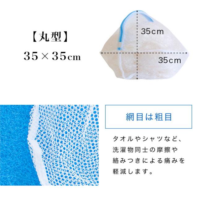 35×35cmの丸型洗濯ネットです。伸縮性のある衣類やタオルやズボンなど長さのある洗濯物をザックリ入れてお洗濯。洗濯物の絡み合いを防ぎ、衣類の痛みや洗浄力の妨げを防ぎます。