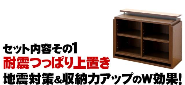 | 当店で大好評「つっぱり耐震書棚」の「つっぱり構造」を採用した「専用上置きユニット」+「扉パーツ4枚」+「シェルフ本体」の幅75cmサイズセットです。 上置き本体は、独自の伸縮構造により、本体と組み合わせることで、床から天井までの高さ235cm?260cmと幅広く対応。地震による本棚の転倒防止に役立ちます。 上置き上下2段の収納部分は、コミックがしっかり収まる高さとなっており、収納効率もアップします。 ・上置ユニット 各空間内寸/ 約W32.2xD28xH40.5cm。 可動棚は計2枚、側板の厚み2cm。 棚板は各空間で、3.2cmピッチ11ヶ所移動できます。 ・シェルフ本体 各空間内寸/ 約W34xD28xH83.5cm。 可動棚は計8枚、側板の厚み1.8cm。 棚板は各空間で、3.2cmピッチ19ヶ所移動できます。 起震車による耐震テストで震度7をクリアしました。 大容量の耐震本棚。 適切に設置すれば大地震でも倒れない耐震性能を発揮する安心安全の耐震シェルフ。 地震対策された壁面収納で、自分だけのホームライブラリーを作れます。 北欧好きやDIY好きにもオススメ! 一人暮らし・ファミリー・子供部屋からオフィスまで 新生活におすすめの高品質でおしゃれな家具・インテリア・生活雑貨の激安通販サイト、家具ドキッ!です!! なるべく安い価格でご提供するために、工場出荷(ファクトリーアウトレットシステム)でのお届けを導入しています。 |