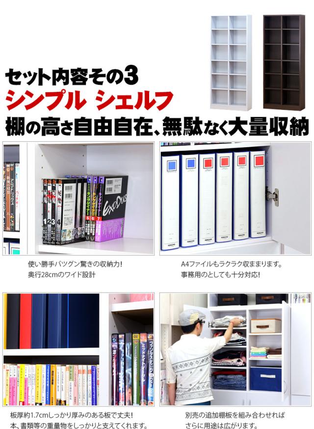 定番の本棚の扉付きと上置き付きセットした壁面収納。ホワイト、ブラウン選べるカラー。CDやDVD、雑誌や書類、小物のディスプレイにも最適。別売り追加棚板あり。