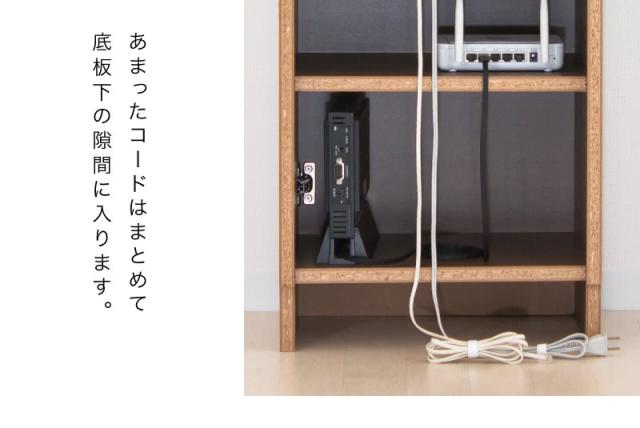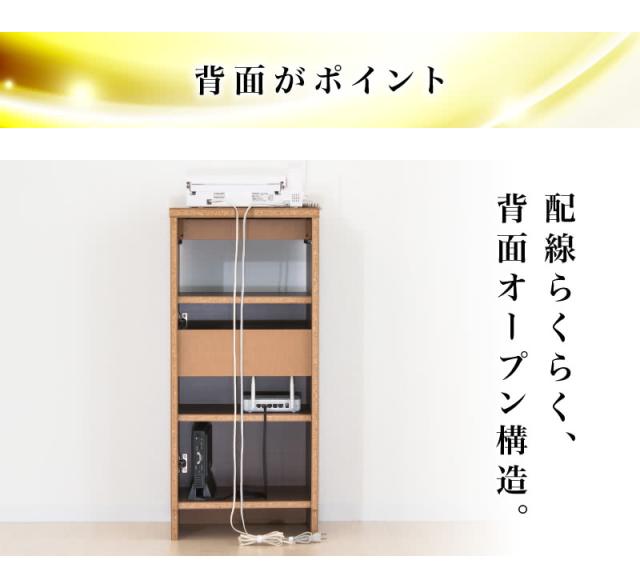 小物が入る引き出し付き、オープンラックは飾り棚として、大容量の扉内は背面オープン構造とコード穴で配線コードもすっきりします。