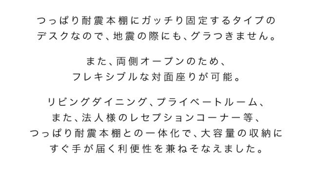 | このページの商品は『つっぱり耐震本棚(幅45cm×奥行き19cm)+机』のセット商品です。 商標登録第5843275号:突っ張り耐震 実用新案登録第3213053号:突っ張り耐震本棚用デスク 起震車による耐震実験を行った耐震本棚に、デスクの機能が追加された正規品です。 当社のオリジナル耐震書棚は、震動時、前後左右に踏ん張る一番大切な部分の主軸板が鉄芯(鉄心)による連結になっています。 天井まで空いたスペースを無駄なく有効利用したい方にもオススメの耐震機能を備えた突っ張り式本棚。 本体は上段棚と下段棚に別れており、重ねあわせて設置する構造となっています。 最大の特徴は一般的な本棚の高さが約180cmの所をこの本棚は最大260cmの高さまでご利用して頂く事ができます。 デスクは約幅100cm×奥行き40cmのスリム型。 耐震本棚にがっちり固定されるので地震の際にもグラつきません。 両側オープンのためフレキシブルな対面座りが可能。 リビングダイニング、プライベートルーム、法人様のレセプションコーナー等、突っ張り本棚との一体型で、大容量の収納にすぐ手が届く利便性を兼ね備えました。 ・耐震つっぱりデスク ・耐震突っ張りデスク ・つっぱり耐震デスク ・突っ張り耐震デスク 北欧好きやDIY好きにもオススメ! 一人暮らし・ファミリー・子供部屋からオフィスまで 新生活におすすめの高品質でおしゃれな家具・インテリア・生活雑貨の激安通販サイト、家具ドキッ!です!! なるべく安い価格でご提供するために、工場出荷(ファクトリーアウトレットシステム)でのお届けを導入しています。 |
