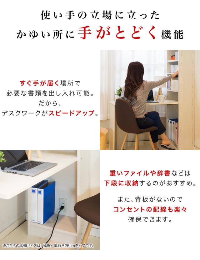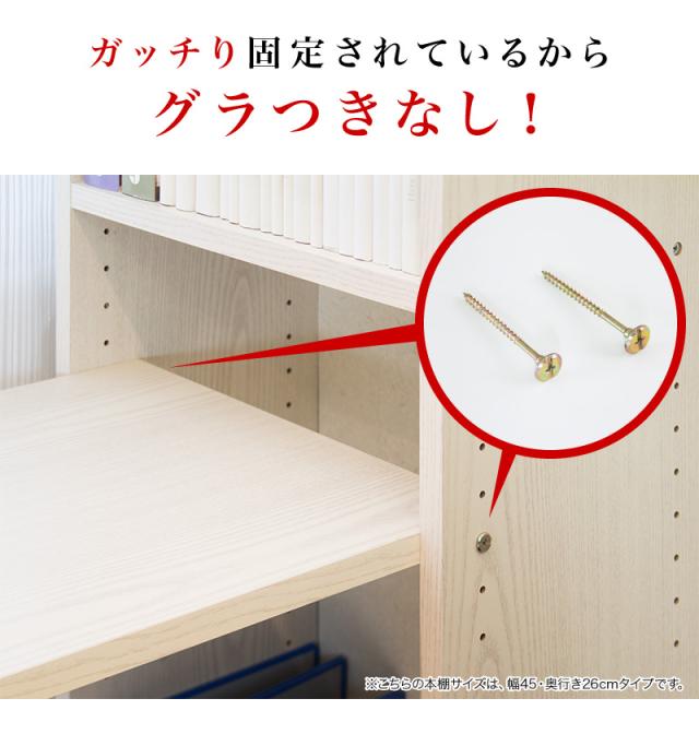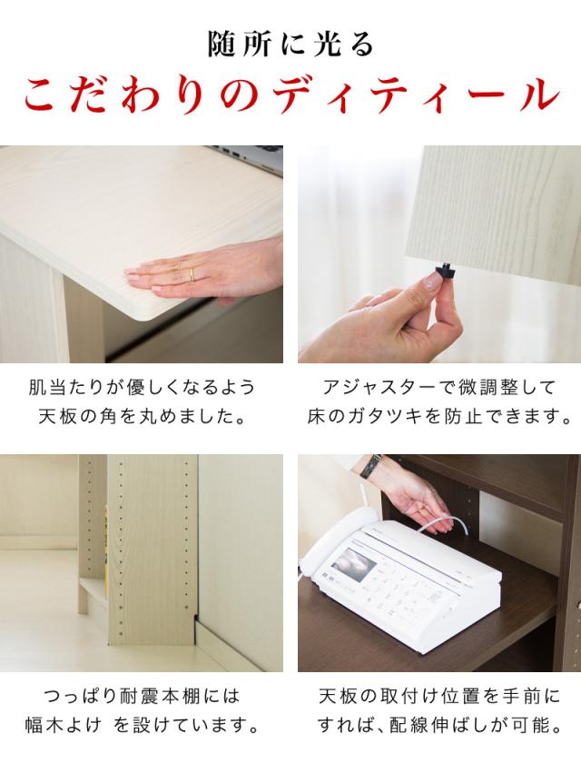 | プリント化粧繊維板 固定棚:2枚 上段棚用可動棚:2枚 下段棚用可動棚:3枚 転落防止金具付き:4本 デスク脚部アジャスター付き |