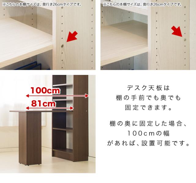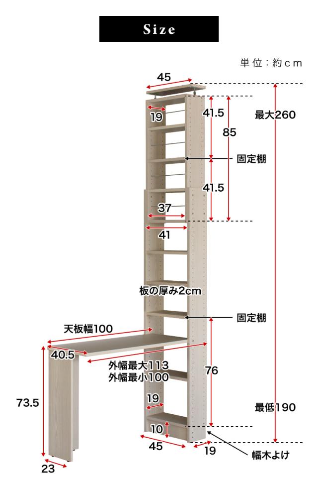 | 本棚:約幅45cm×奥行き19cm×高さ190cm?260cm 机:幅100cm×奥行き40.5cm×高さ73.5cm |