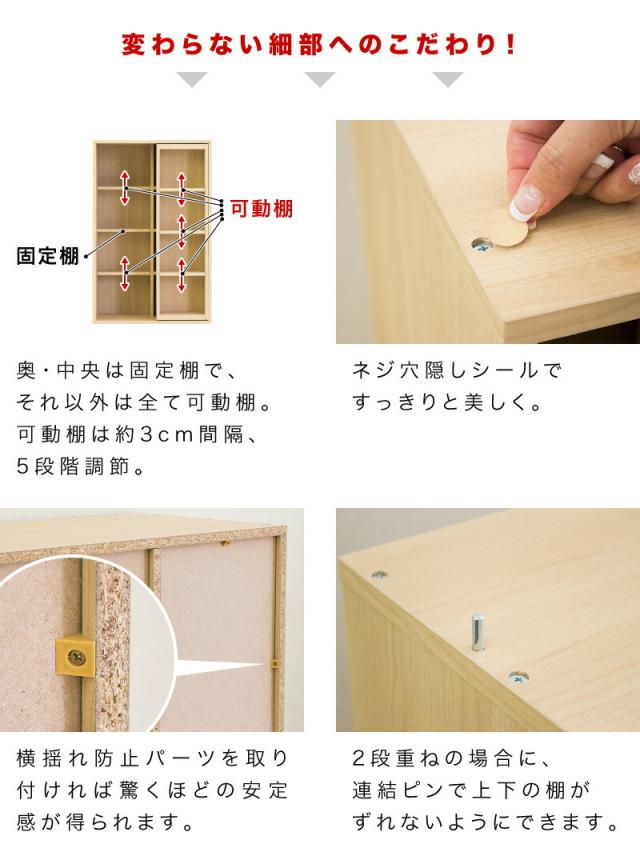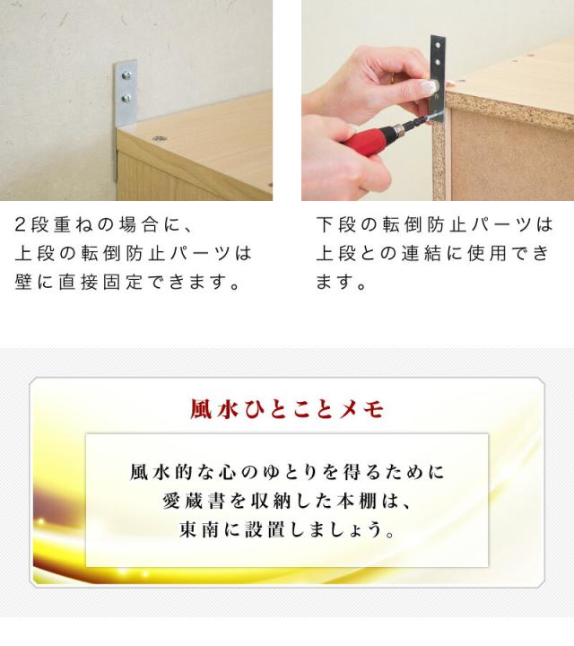 はみ出ず、DVD・本を劣化や汚れから護ります。安心宣言!!各種補助金具完備!転倒防止パーツ倒れるのを防ぐ転倒防止パーツ付きで安心。横ゆれ防止パーツ本体裏側には横ゆれ防止のパーツを使用。重量物の収納もバッチリ!たっぷり収納を誇るからには、もしもの為の安定感を強化しました!2段重ねにしてさらに大量収納可能!固定は連結ピンと補強金具で2重の安心!上下に2台重ねることで、限られたスペースにさらに大量に収納出来ます、ビス穴をキレイに隠すシール付属。前後2段スライド棚では当たり前なので、言うのが遅くなりましたが…!勿論大量に収納できます!!
