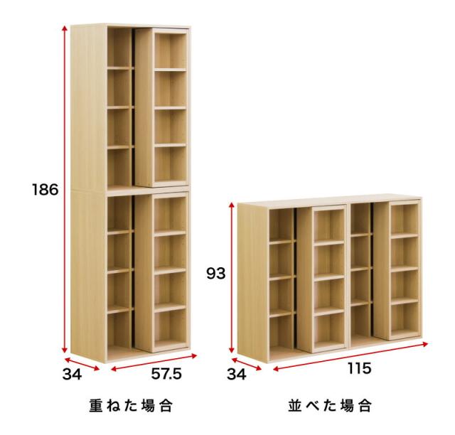 | 商品仕様 | 材質:プリント紙化粧繊維板 奥・中央は固定棚 1台あたり可動棚大4枚(本体)・小3枚(スライド棚) ※以下付属品は、2台購入時に必要となるパーツです。 連結時にご使用ください。 (連結用ピンx1 連結金具(転倒防止用金具)x1) |