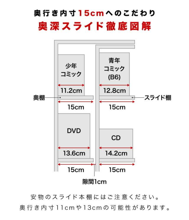 奥深の極み 価格だけで判断できない。多くのスライド本棚は部材の採寸上、奥行き13cm程度で作られていました。価格を安く提供する為には、使用する板材を規定のサイズ内に抑える必要がある為、やむ得ない部分でもあります。しかしこれではDVD、大判書物などの収納には対応しておらず、実用的に不便な点もありました。当スライド本棚はただ安くするわけでなく、まず、しっかり収納できる「奥行き」をもとに開発されてた上で極力コストダウンしました。前列に2台ものスライド棚を設置した「ダブルスライド式」本格奥深仕様!