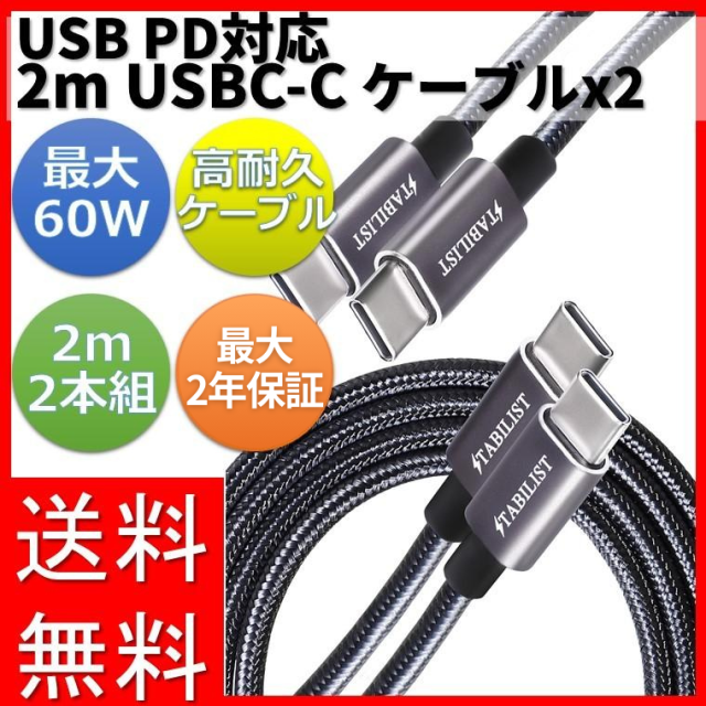 2m2本組 60W対応 USBPD 急速充電ケーブル USB-C Type-C C to C typec PD対応 USB2.0 480Mbps データ転送 充電コード ctoc USBC タイプc たいふc MacBook Pro/Air iPad Pro Galaxy 等対応 STABILIST スタビリスト