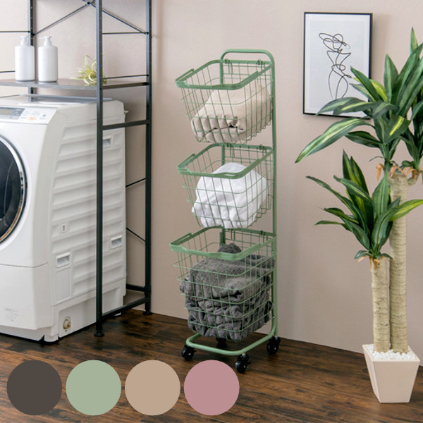 ランドリーワゴン 3段 スリム 幅35cm スクエアバスケット ランドリーラック バスケット付 ニュアンスカラー 角型 ( ランドリーバスケット 洗濯 ランドリー ワゴン 35cm 脱衣かご ランドリー収納 収納 洗濯かご 3個 大容量 )