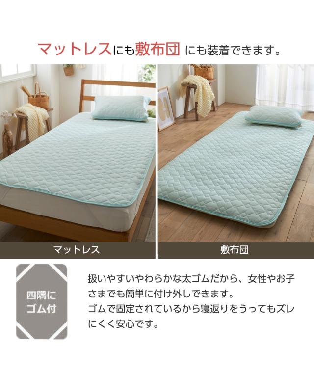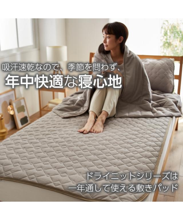 季節に関係なく人は寝ている間、一晩にコップ1杯の汗をかくといわれている中、寝ている間の汗を吸収し素早く放出することでムレにくくしてくれるドライニットの敷パッドです。 ドライニット素材が肌当たりやわらかで、通気性も良く、こもったムレでかいた汗も、すぐに乾きやすいので、一年中使えて重宝します。