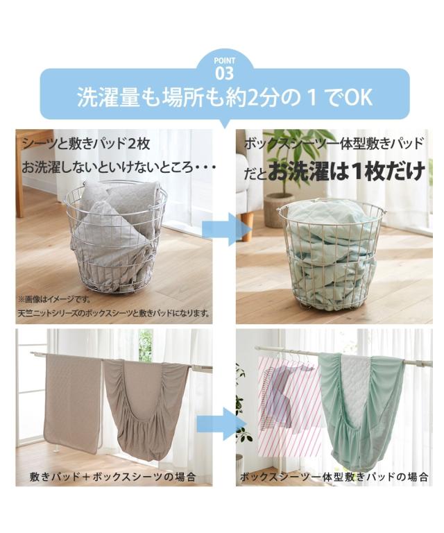 季節に関係なく人は寝ている間、一晩にコップ1杯の汗をかくといわれている中、寝ている間の汗を吸収し素早く放出することでムレにくくしてくれるドライニット。 敷パッドとボックスシーツが一緒になったボックスシーツ型敷パッドはマットレス・敷布団両方に装着できます。マットレス・敷布団をすっぽり覆うので、寝相が悪くてもズレにくく見た目もすっきり。 ドライニット素材が肌当たりやわらかで、通気性も良く、こもったムレでかいた汗も、すぐに乾きやすいので、一年中使えて重宝します。