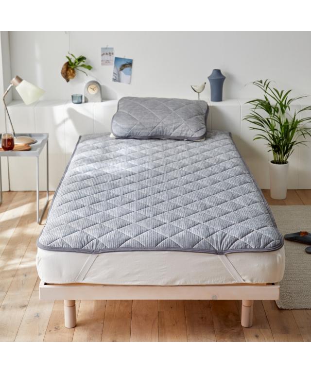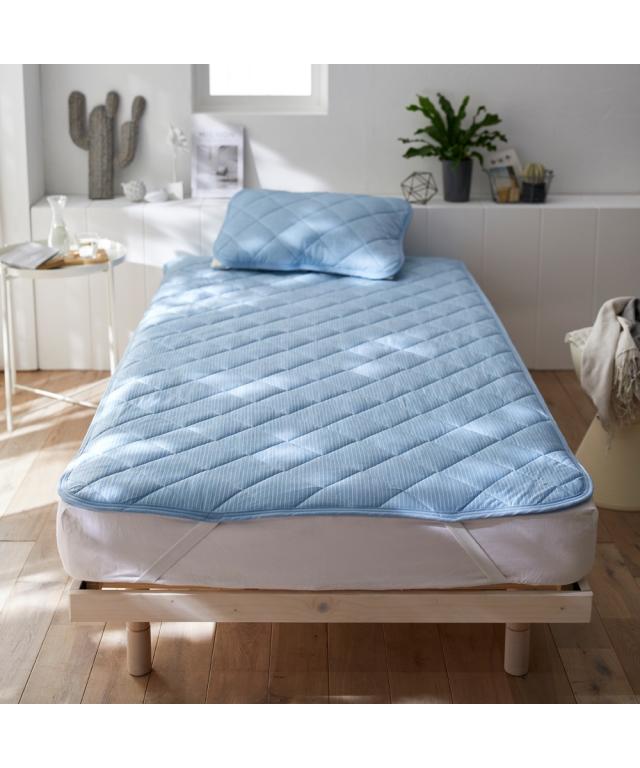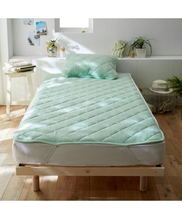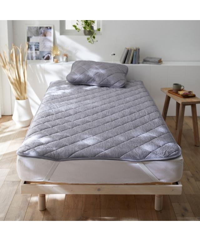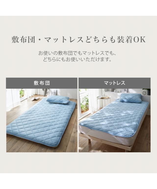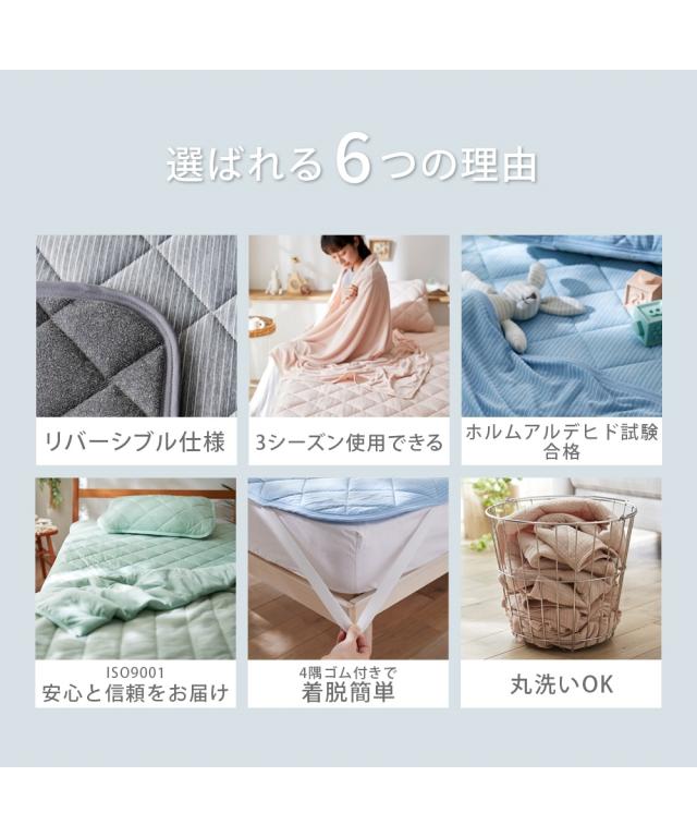 片面はひんやり冷感素材ともう片面は綿混タオル地素材を使用したリバーシブルタイプの敷きパッド。また今年は両面吸汗速乾機能をプラスしての登場です。1枚で2役のリバーシブルタイプの敷きパッドは春〜秋にかけてより快適に夜を過ごして頂けます。