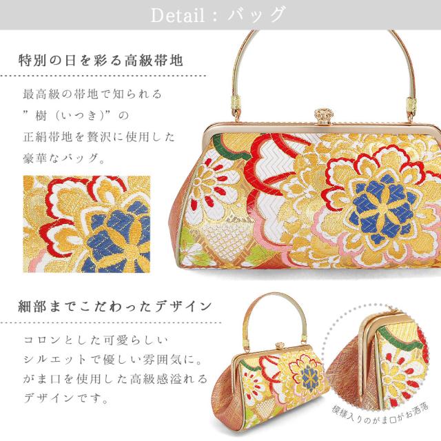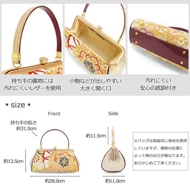 金色の糸を織り込んだ華やかな柄の正絹帯地を使用し、特別な日にぴったりの豪華なバッグに仕上げました。