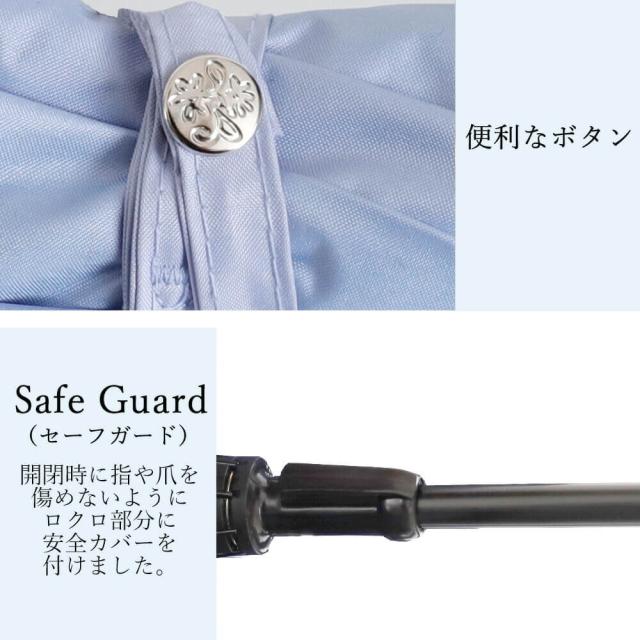 ※傘生地には防水撥水加工を施し、縫製には撥水糸を使用していますが、激しい雨や長時間のご使用では雨が染み込むことがございます。また飾り加工部分(刺繍、ステッチ、パイピング、テープ等)はデザインの特性上、完全な防水撥水加工が難しい場合があり雨が染みやすいのでご注意下さい。
