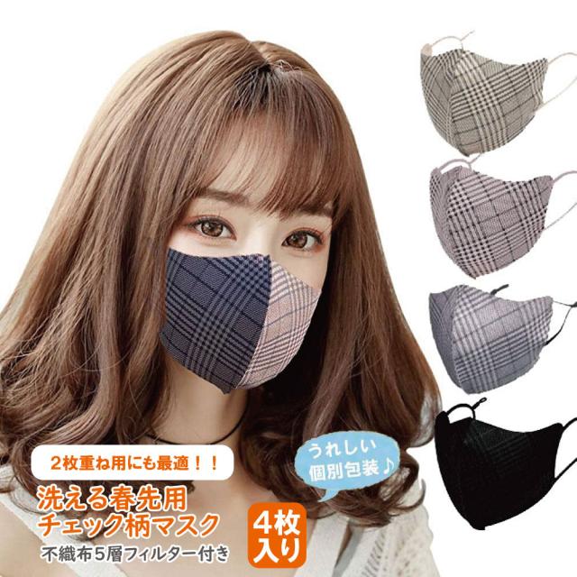 マスク 洗える おしゃれなマスク 立体マスク 4枚入り チェック柄マスク ファッションマスク 息がしやすい 蒸れない 耳紐調整 個別包装