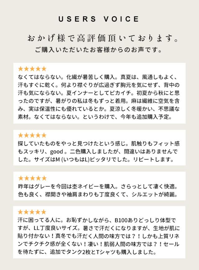 - さすがリネン100%は良いですね。 しっかり汗を吸収してくれます。 暑い職場にインナーとして着ていく時も涼しくサラッと感じます。