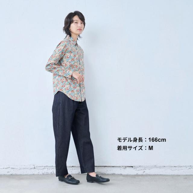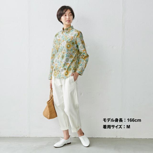 特性 LIBERTY社のコットン100%タナローン生地を使って作られた、ボタンダウンシャツ。少しボーイッシュでカジュアルなスタイルになりがちなボタンダウンシャツですが、フェミニンな柄なので、上品に着て頂けます。一枚で着て頂くのは勿論、セーターやジャケットのインナーとしてリバティ柄をチラ見せすれば、コーディネイトのアクセントになります。