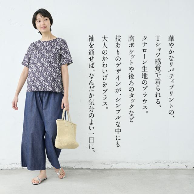 特徴 華やかなリバティプリントのTシャツ感覚で着られるタナローン生地のブラウス。胸ポケットや後ろのタックなどの技ありのデザインが、シンプルな中にも大人のかわいげをプラス。袖を通せばなんだか気分のよい1日に。