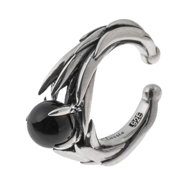 躍動する刃のラインが耳元を走る、モードなイヤーカフ。丸みのあるブラックオニキスを核に、シャープなエッジが流れるように包み込み、磨き上げたシルバーの艶といぶしの陰影が立体感を強調します。ピアスホールは不要。挟むだけで安定し、軽やかな着け心地で長時間でも快適です。内側の当たりは丁寧に整え、肌への負担を抑える仕上げ。制作はアトリエにて、一点ずつ成形・彫り・磨きを重ねた確かな手仕事。端正でありながら存在感は力強く、Tシャツからジャケットまで、装いを都会的に引き締めます。アクセサリーでありつつ、小さな現代アートのような気配を放つ一本です。素材はシルバー925、石はオニキス。<br /><br />※1個単位(片耳分)での販売となります。