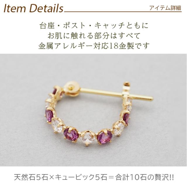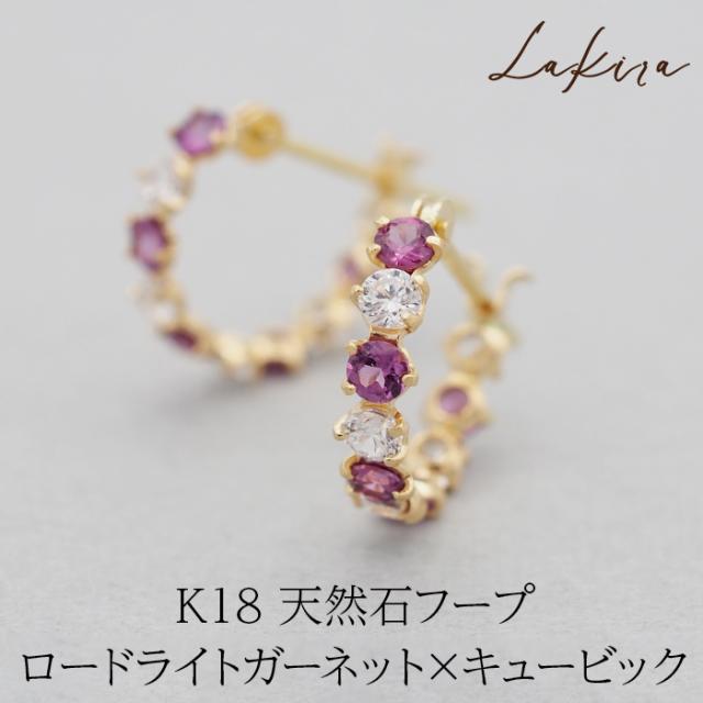 フープピアス レディース K18 天然石 誕生石 ロードライトガーネット【Lakila】品質保証書つき 金属アレルギー 18金 キュービックジルコニア 片耳 1個