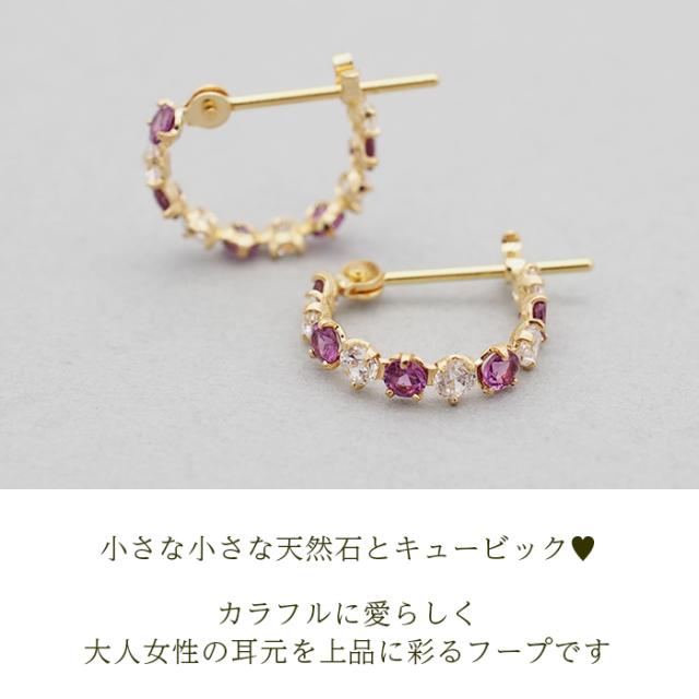 | 極小サイズのK18(18K)フープピアス。 透き通る可憐な天然石とキュービックジルコニアを交互に並べたカラフルで気分も上がる愛らしいピアスです! 小さく上品な18金製なので、かわいいのに大人の雰囲気。 金属アレルギー対応&誕生石、さらに2個以上なら高級感のあるケースに入れてお届けするので、プレゼントにも最適です♪ |
