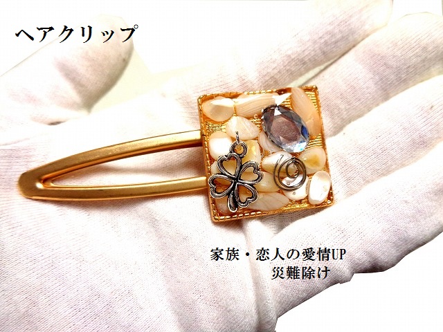 家族や恋人の愛情UP・災難除け★マザーオブパール★クローバー・四つ葉★ヘアクリップ★パワーストーン★護符(霊符)