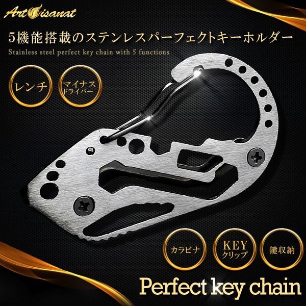 マルチドライバー キーホルダー ステンレスパーフェクト5機能 マイナス レンチ カラビナ キークリップ 鍵収納