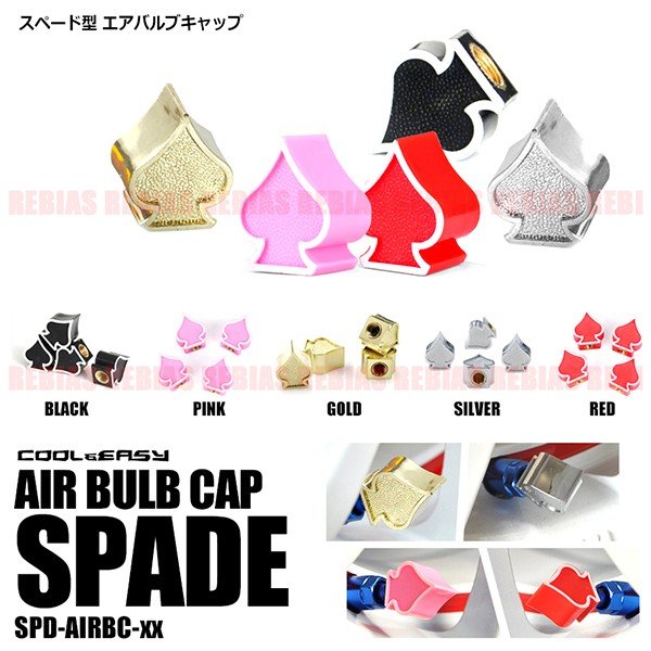 スペード!! エアバルブキャップ!!小さなド派手。スペードの形のエアバルブキャップ。純正のバルブキャップと交換するだけ。リムガードやホイールナットキャップとのコーディネートも楽しめます。汎用品なのでバイクや自転車にも装着可能。※米式バルブ用の製品となります。他の英式、仏式には使用できません。内容:4個入り(自動車1台分)※商品の使用中に生じた如何なる損害も弊社ではその一切の責任を負いかねます。※マニュアル/説明書は付属しません。※使用方法のサポートはございません。※輸入商品のため小傷や汚れ等ある場合がございます。※ご閲覧の液晶環境により色味が異なって見える場合がございます。※仕様は改善の為に予告なく変更する場合があります。★こちらの商品はメール便発送で送料無料です。(メール便での発送はポスト投函になります、 代金引換、日付指定はできませんのでご了承下さいませ)